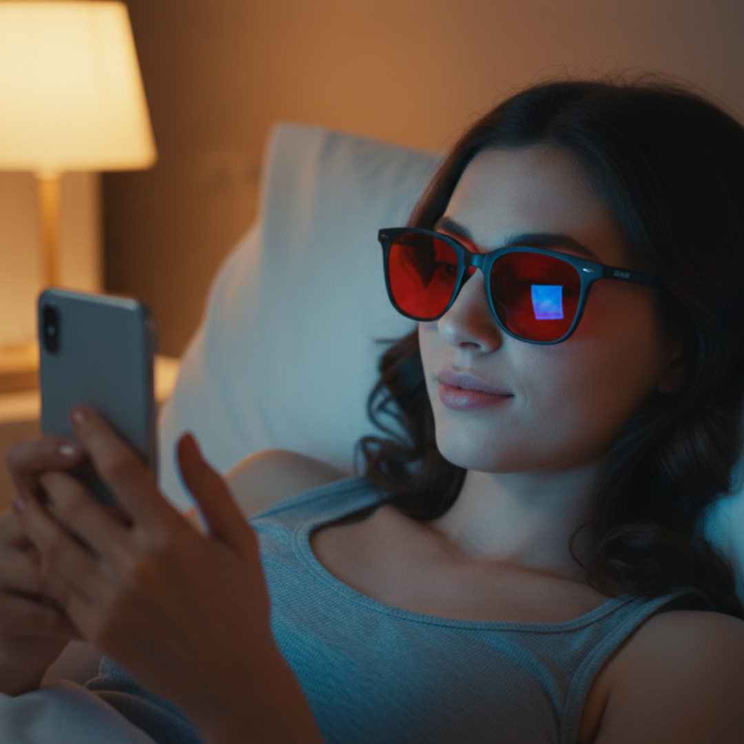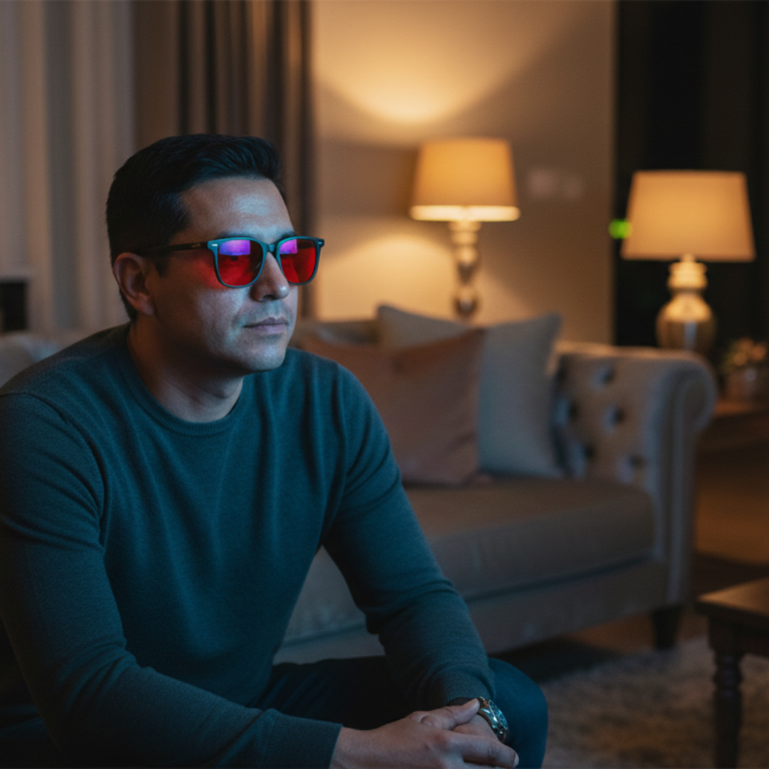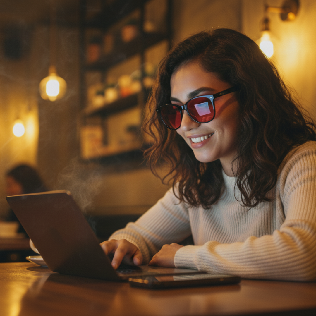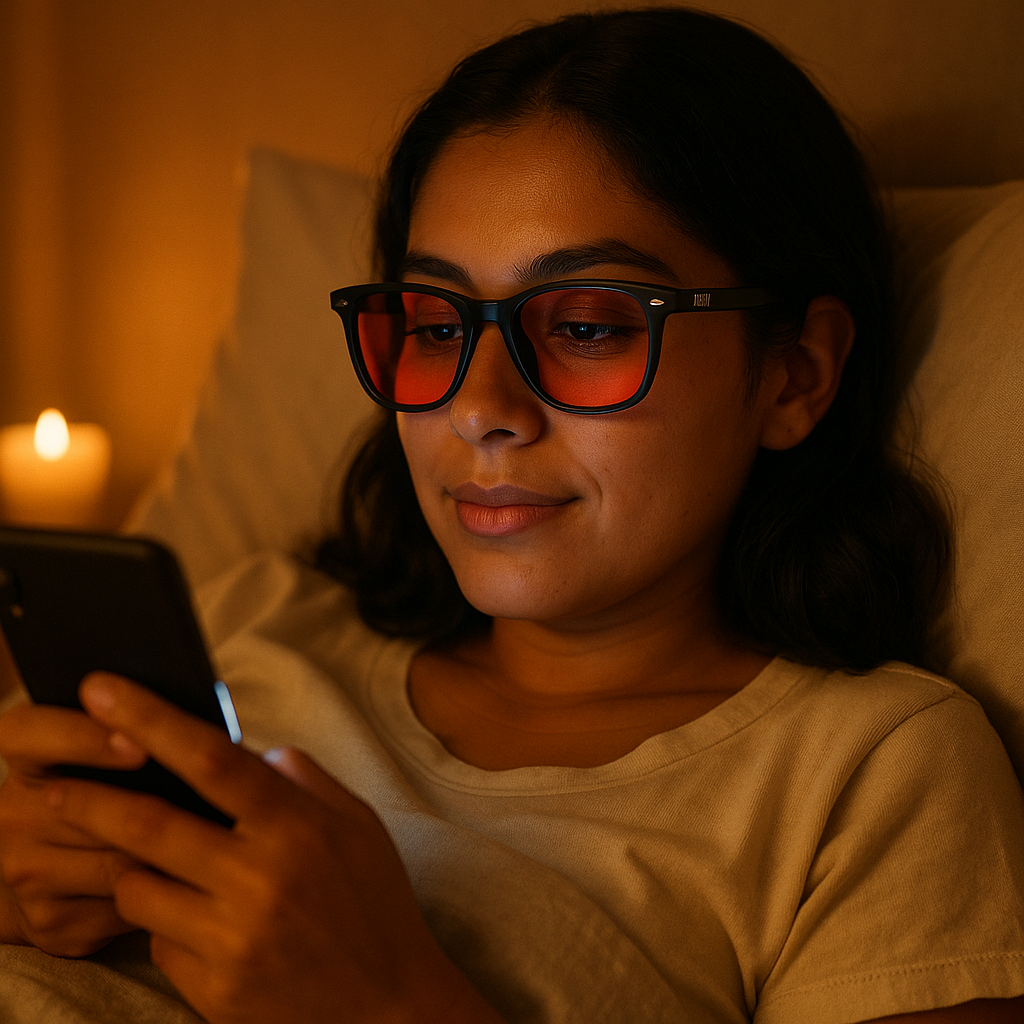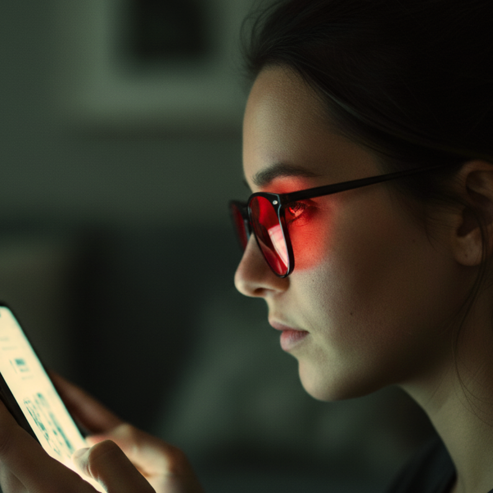 Por la noche, nuestras lentes rojas filtran la parte más estimulante de la luz de pantallas (móvil, TV, ordenador). Así bajan el deslumbramiento y a tu cerebro le resulta más fácil desconectar. No es un dispositivo médico.